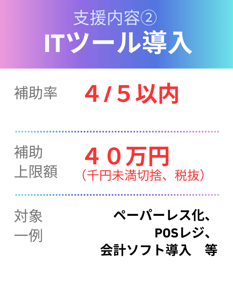 募集要項(P9)補助対象事業 一覧に該当するソフトフェア等の購入に要する経費(ライセンス料含む)、その他生産性の向上に資するクラウドソフトウェア及びパッケージソフト導入費